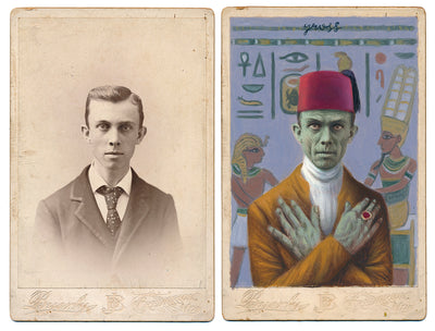 In 2006, Chronicle Books published Alex's first monograph, The Art of Alex Gross. Alex's second fine art book, Discrepancies, was published by Gingko Press in 2010, and includes an introduction by former LA Weekly Art Critic Doug Harvey. In 2012, Gingko published Alex's third book, Now And Then, The Cabinet Card Paintings of Alex Gross, which includes 98 mixed media paintings. October 2014 brought the release of Alex's fourth book, entitled Future Tense, Paintings by Alex Gross, again published by Gingko Press. Future Tense is 96 pages, and features 40 paintings done between 2010 and 2014. The introduction was written by Caleb Neelon. Transformations was published by Gingko Press in 2019 and is Alex’s fifth, and most recent book. At 216 pages, it contains before and after images of more than 100 mixed media cabinet card paintings.