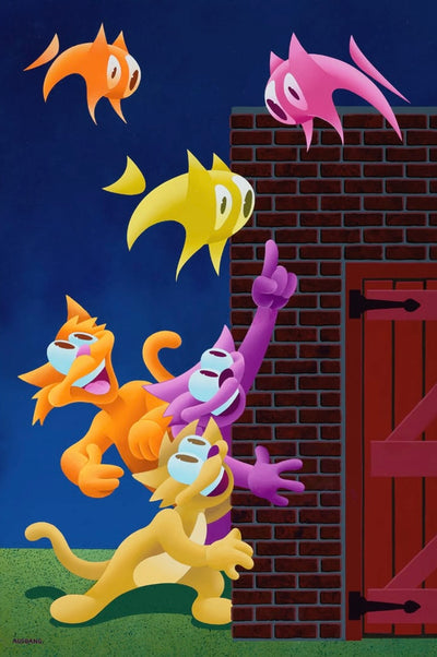 Ausgang draws influence from as many outside channels as possible, from the toy contents of grocery store gumball machines to the latest exhibit at the Whitney. Opinionated but informed, he is able to see the beauty in both a Rembrandt and a rat rod. This variety of interest has led him to design his artwork on the computer but complete it on the easel, the perfect combination of new technology and traditional media.