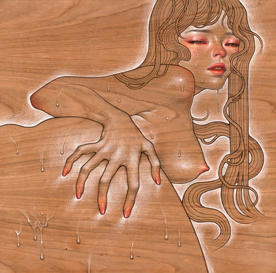 Kawasaki’s work contains contrasting themes of innocence and eroticism, conveying the mysterious intrigue of feminine sensuality. Her sharp imagery is painted with precision onto wooden panels, the natural grain adding warmth to her enigmatic subject matter. The artist’s creative influences include eastern as well as western traditions such as Art Nouveau and Japanese Manga comics. She paints sultry, seductive and uninhibited female subjects with delicate beauty and provocative, direct eye contact. Their graceful gestures and ghost-like features carry mysterious expressions of melancholy and longing.