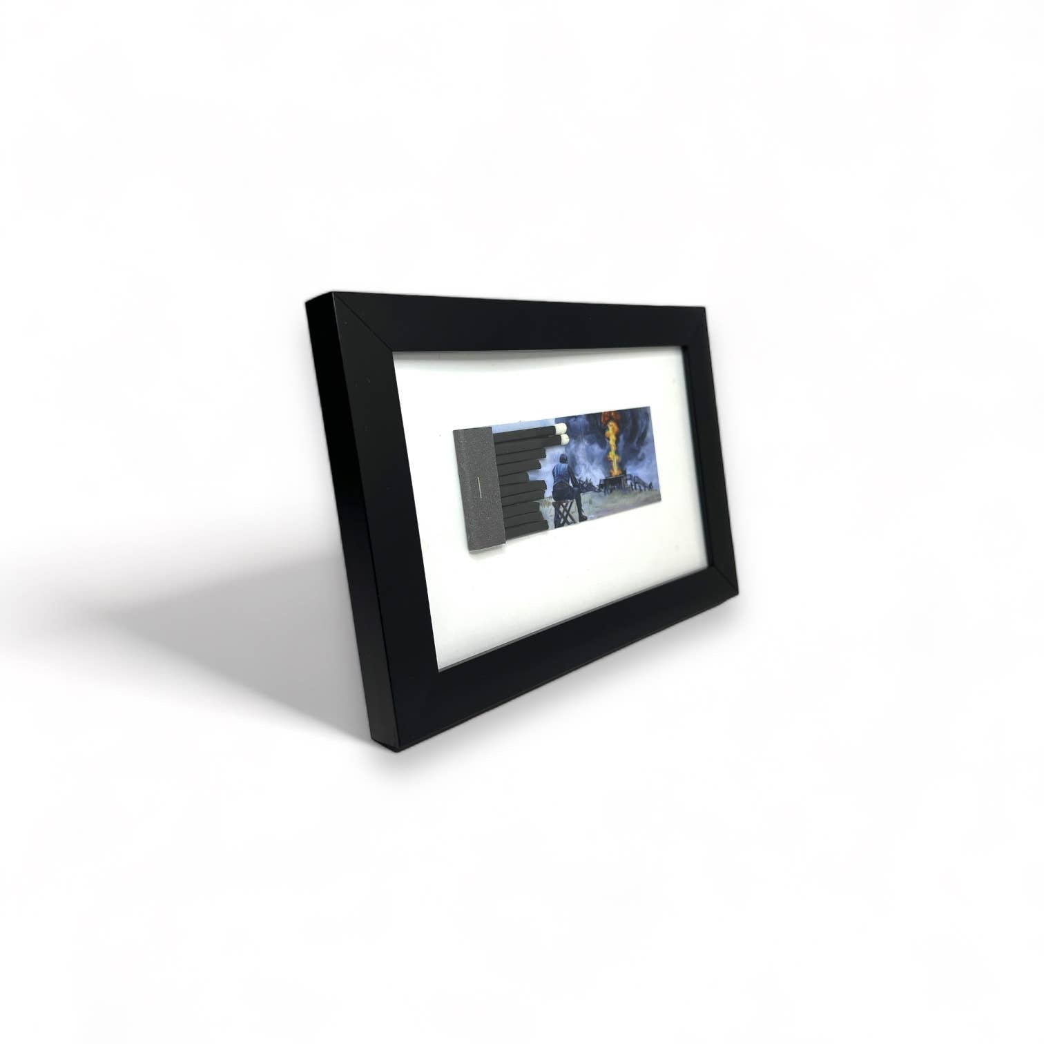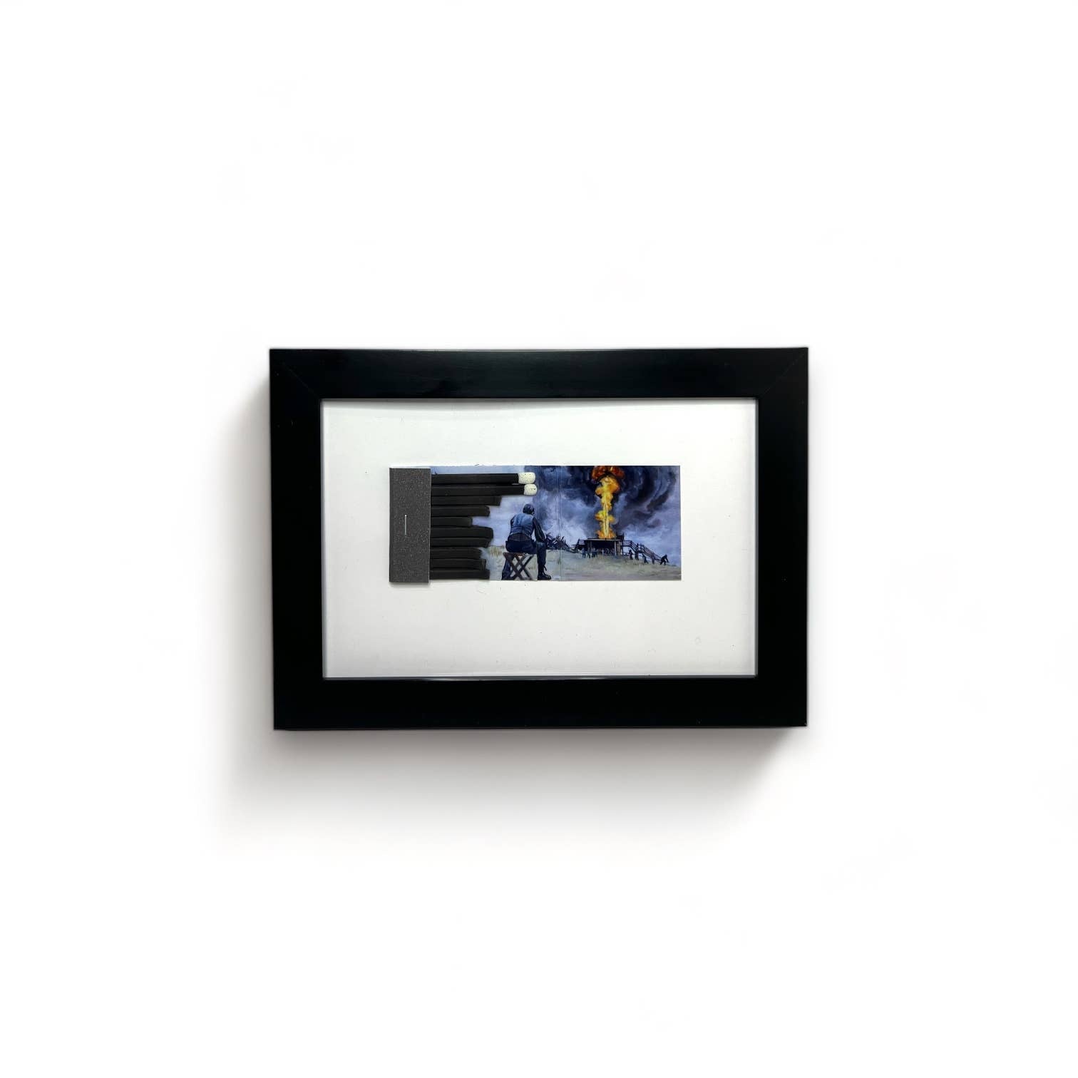 Handmade copy of the original matchbook painting. Scene from Paul Thomas Anderson's "There Will Be Blood" Framed in 4"x6" frame Made in Los Angeles, CA. Materials: Fine Art Baryta 325gsm paper phosphorus match strike paper stem matches staples