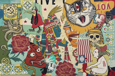 Ravi Zupa considers books the best way to experience art. He has spent decades studying books about the art, mythology, religion, and history of cultures from across geography and time. Entirely self-taught, Zupa looks to works by German Renaissance printmakers, Flemish primitives, abstract expressionists, Japanese woodblock artists, and Mughal painters for inspiration. He also frequently incorporates religious iconography from Europe, Asia, and Pre-Columbian Latin America with revolutionary propaganda from around the world. With a distaste for ironic art or the thoughtless appropriation of culture, he integrates seemingly unrelated images in search of something universal. Zupa does not create any of his art digitally; everything comes from his own hand.
