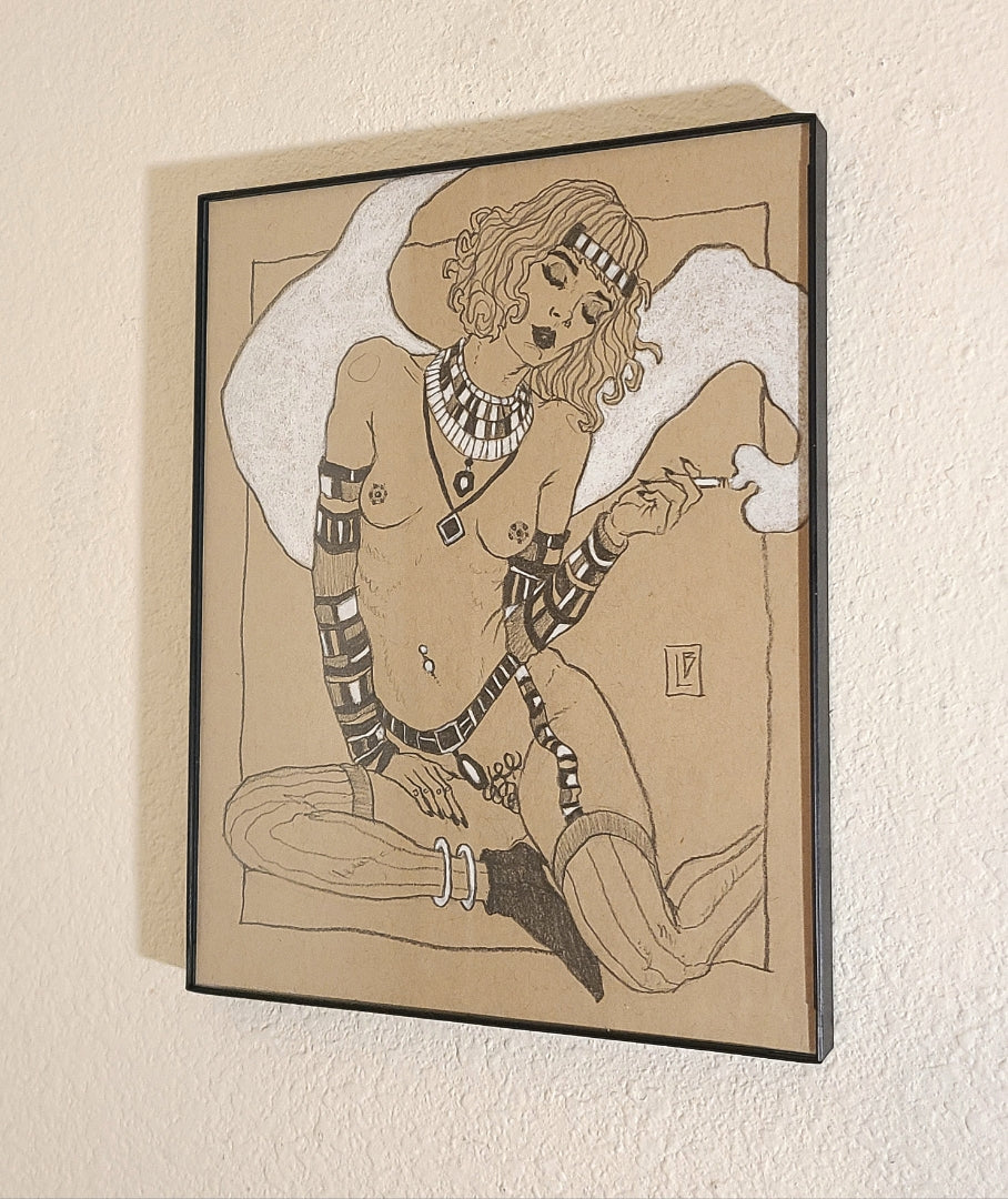 Title: DelphiaMedium: graphite and white charcoal on tan toned archival drawing paper in frameSize: 8x10Total price (gallery commission plus my earning): $300