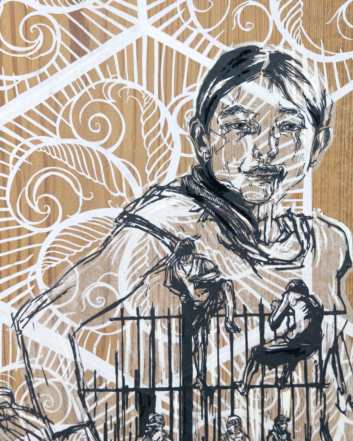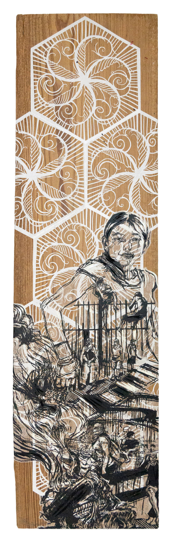 Working across printmaking, drawing, installation, and large-scale public projects, Swoon’s practice is rooted in storytelling, empathy, and social engagement. Her work often centers on lived experience, community, and ritual, blurring the boundaries between fine art, street art, and activism. Whether installed in museums or pasted onto city walls, her figures carry a quiet gravity, tender, resilient, and enduring
