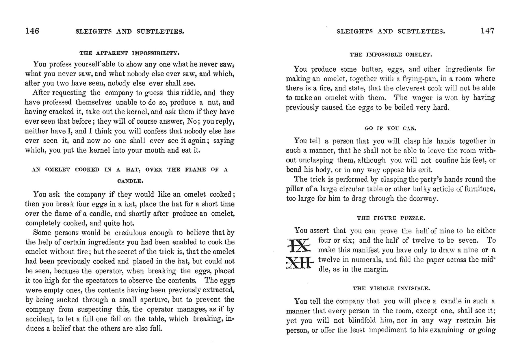 Originally published in 1838, Parlour Magic contains over 350 party tricks that will impress even the most skeptical of audiences. These memorable experiments require only household items, scientific principles, and wit. Using this book, you will be able to: