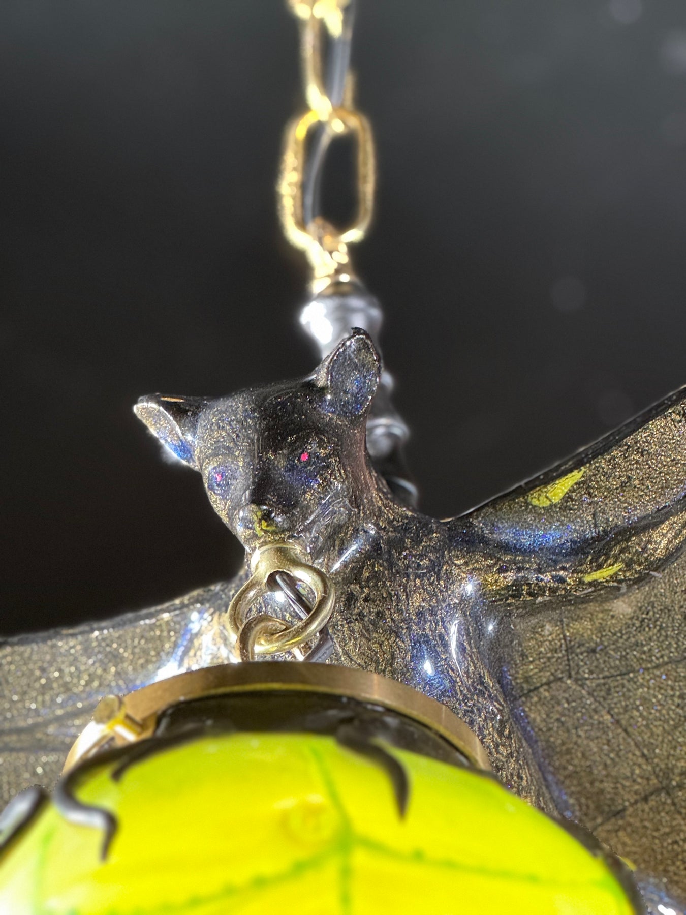 Materials: cast resin Victorian bat, heavily resined glass shade, epoxy clay, epoxy resin, brass lamp parts. Note: both the cast bat and the glass shade were coated in epoxy resin layers with phosphorescent and iridescent powders over the course of 5 days to achieve this effect. It’s difficult to photograph as it looks different from every angle and light source.