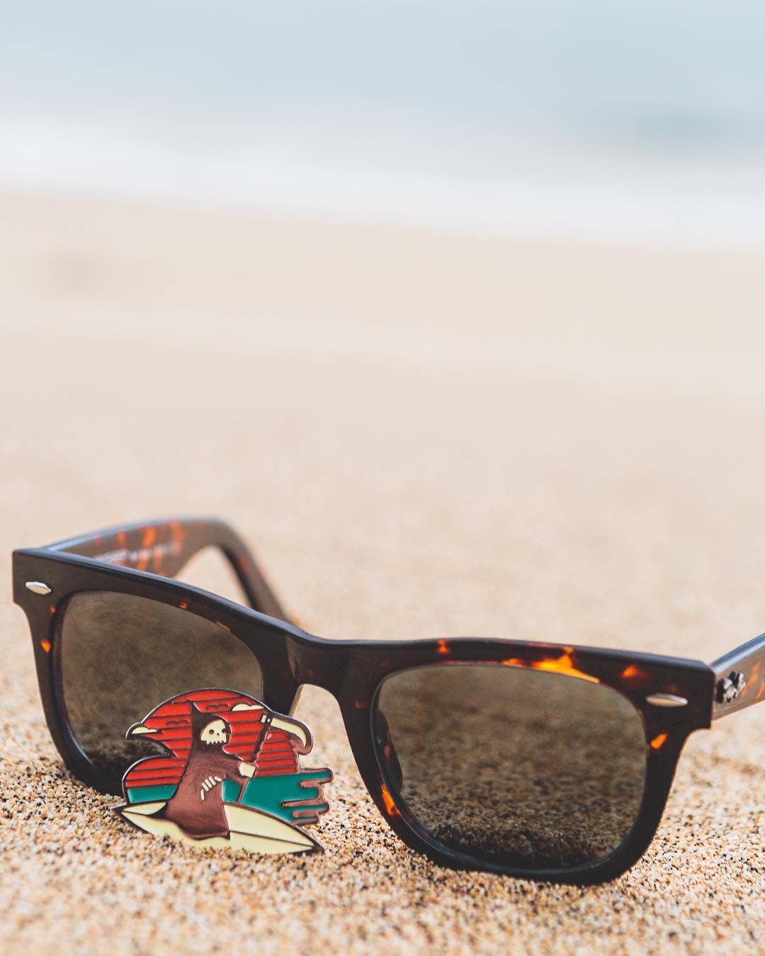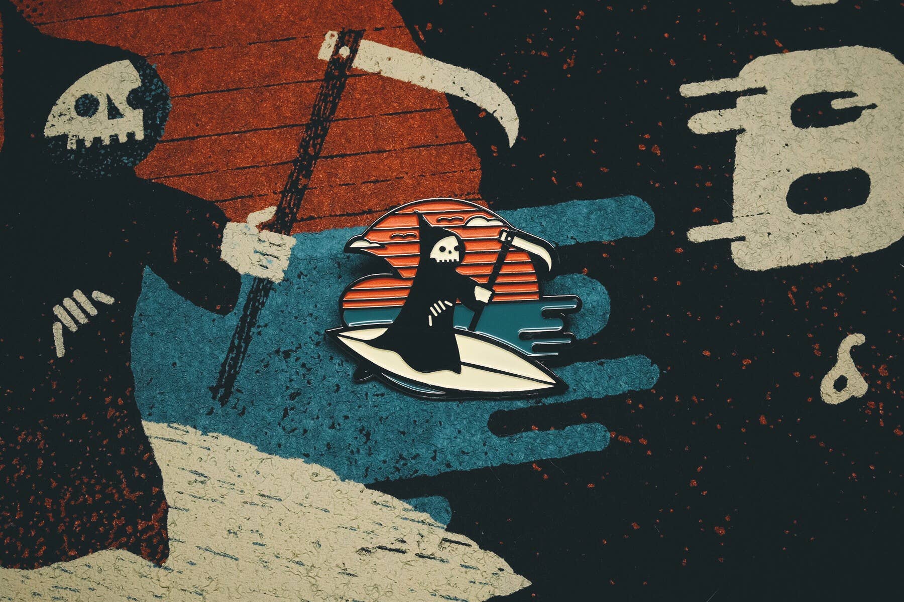 Life's a beach... and then you die. Custom die-cast enamel lapel pin, designed by Charlie Wagers. 1.5" x 1.25" with a single post with rubber clasp, comes mounted on a custom backing-card.