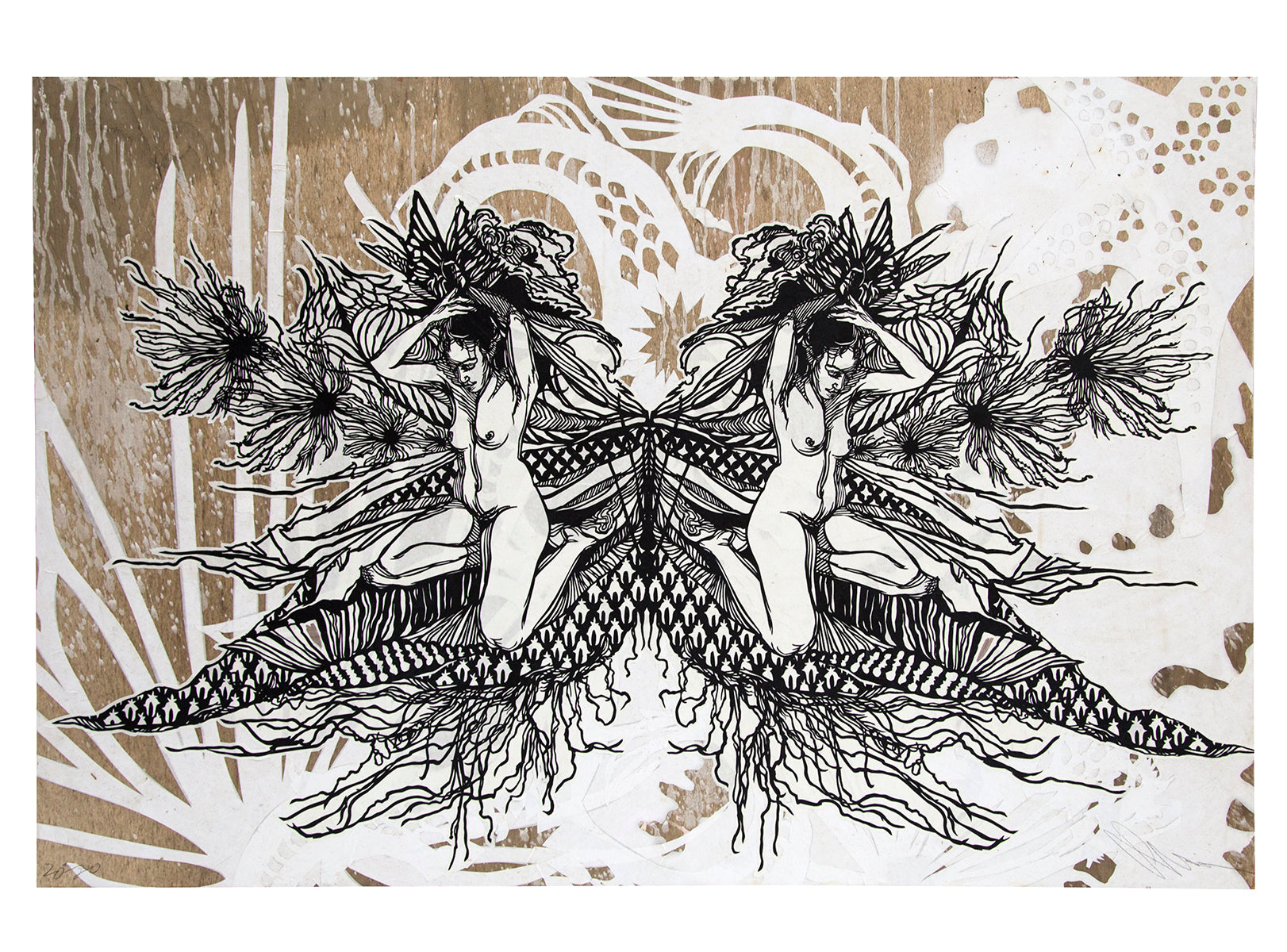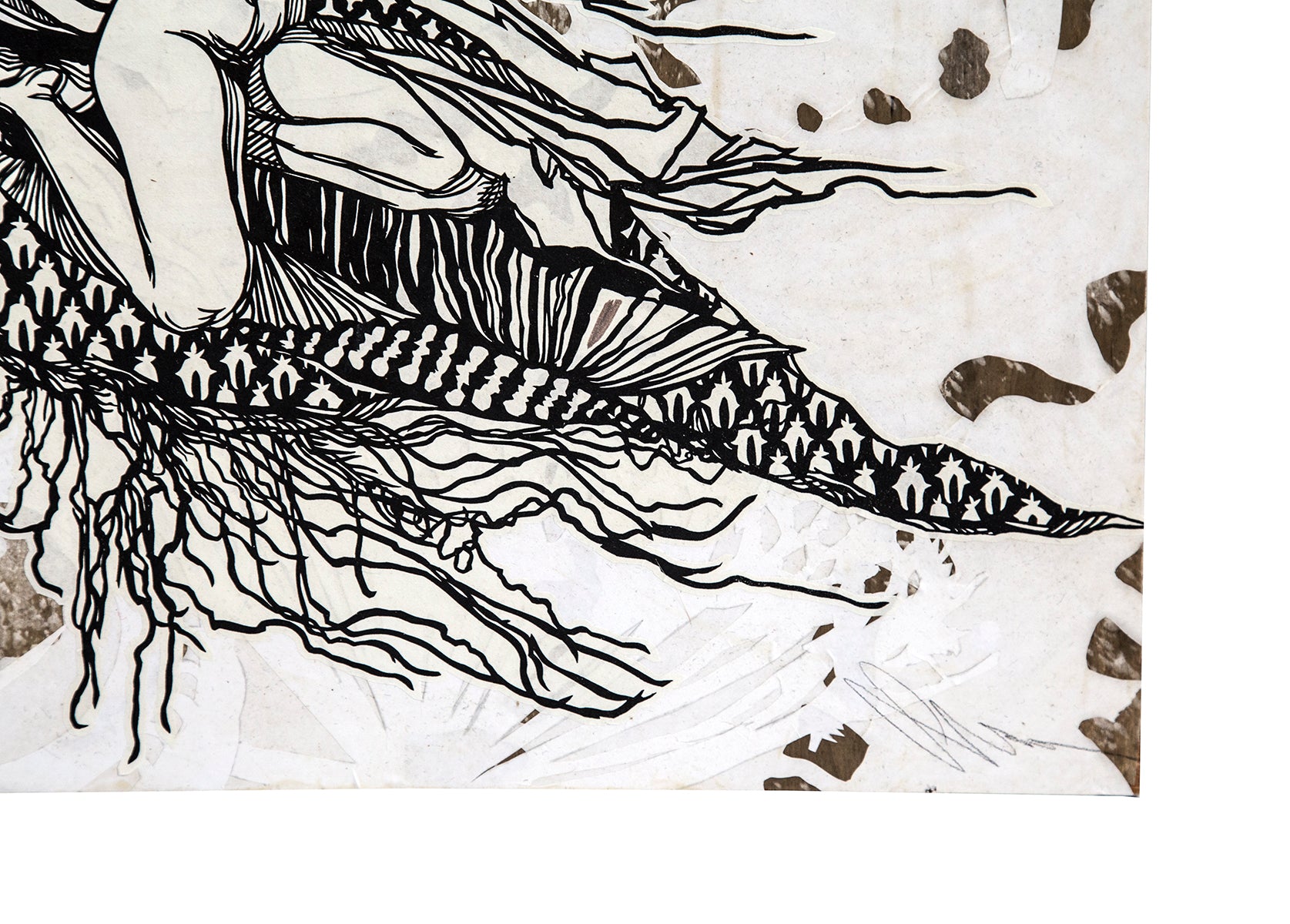 Working across printmaking, drawing, installation, and large-scale public projects, Swoon’s practice is rooted in storytelling, empathy, and social engagement. Her work often centers on lived experience, community, and ritual, blurring the boundaries between fine art, street art, and activism. Whether installed in museums or pasted onto city walls, her figures carry a quiet gravity, tender, resilient, and enduring
