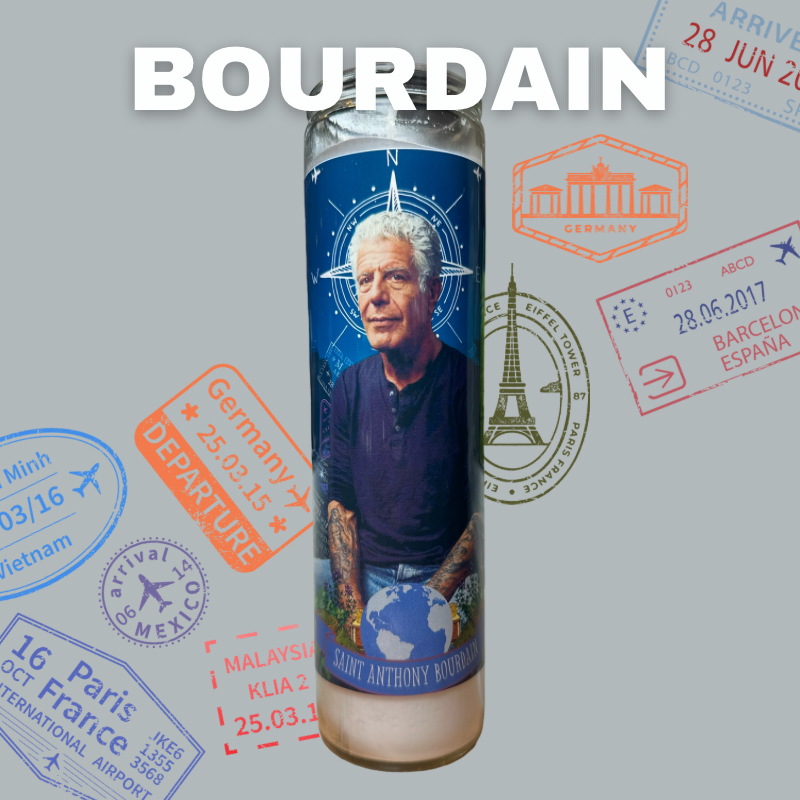 The Luminary Anthony Bourdain Altar Candle Tall white altar/ prayer candle featuring the Patron Saint of Passports. The image is photoshopped then printed and pasted to a traditional "7 day" white altar candle. Placement may vary slightly as these are hand-cut and placed. Please exercise caution when handling the candles and in general keep them in moderate conditions. While sturdy, ultimately these are art prints and are not able to withstand moist hot conditions. If you are interested in custom orders, making a larger order, or have any questions feel free to message me. Praise Adele!