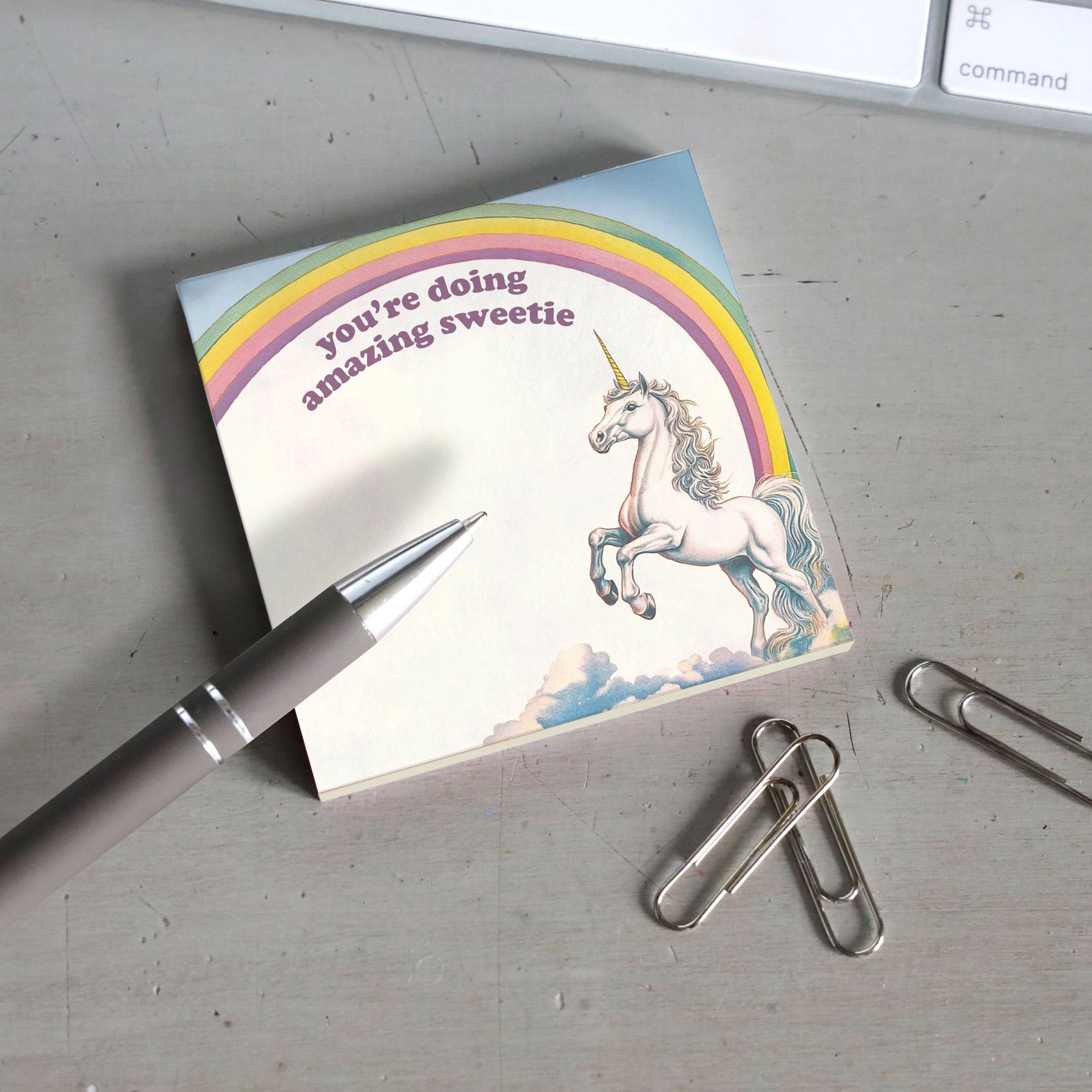 Get ready for some hilariously over-the-top motivation with our "You're Doing Amazing, Sweetie" sticky note! Featuring a vintage illustration of a rainbow and unicorn, this note takes positive reinforcement to a whole new level.